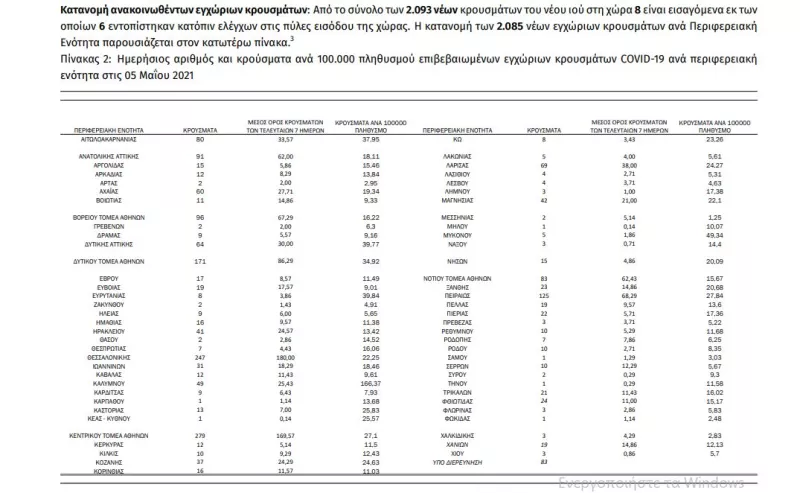 Τα νέα εργαστηριακά επιβεβαιωμένα κρούσματα της νόσου που καταγράφηκαν τις τελευταίες 24 ώρες είναι 2093 σε 33.950 τεστ.