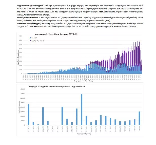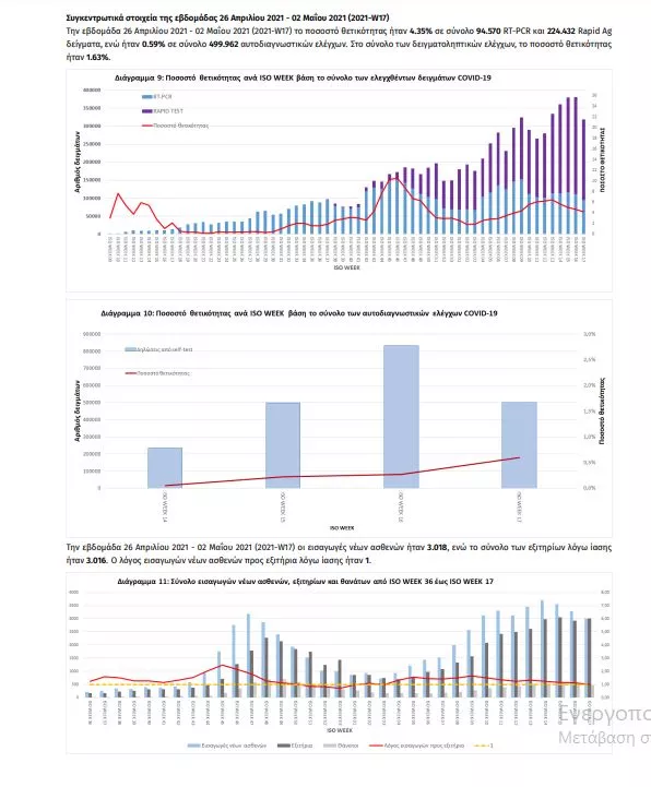 Την εβδομάδα 26 Απριλίου 2021 - 02 Μαΐου 2021 (2021-W17) το ποσοστό θετικότητας ήταν 4.35% σε σύνολο 94.570 RT-PCR και 224.432 Rapid Ag