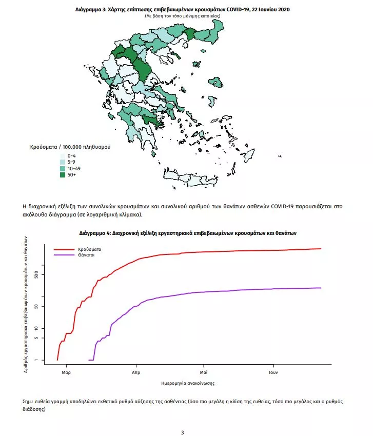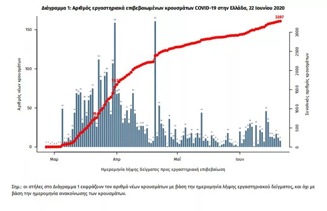 Τα στοιχεία που παρουσιάζονται αφορούν περιστατικά από την επιδημιολογική επιτήρηση της νόσου από το νέο κορωνοϊό (COVID19), με βάση τα δεδομένα που έχουν δηλωθεί στον ΕΟΔΥ και καταγραφεί μέχρι τις 22 Ιουνίου 2020 (ώρα 15:00). Τα νέα εργαστηριακά επιβεβαιωμένα κρούσματα της νόσου είναι 21. Ο συνολικός αριθμός των κρουσμάτων ανέρχεται σε 3287 (ημερήσια μεταβολή +0.6%), εκ των οποίων 54.9% άνδρες.