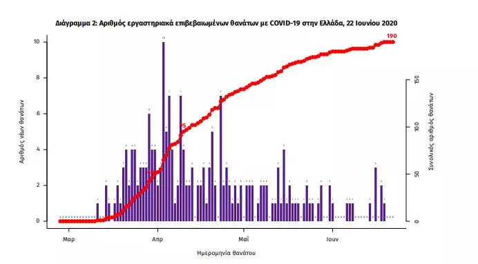 Δεν έχει καταγραφεί κανένας νέος θάνατος ασθενούς με COVID-19, ενώ από την έναρξη της επιδημίας έχουν καταγραφεί συνολικά 190 θάνατοι. Η μέση ηλικία των ασθενών που απεβίωσαν είναι 76 έτη. Ο αριθμός των ασθενών που νοσηλεύονται διασωληνωμένοι είναι 8 (87.5% άνδρες). Η ημερήσια κατανομή των επιβεβαιωμένων κρουσμάτων είναι η ακόλουθη (η γραμμή παριστάνει την συνολική, αθροιστική κατανομή των κρουσμάτων).