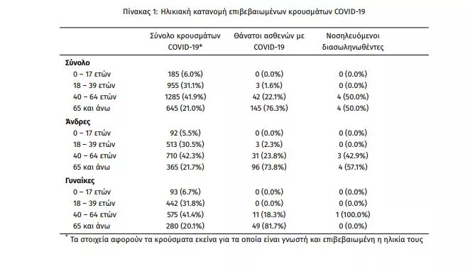 Η μέση ηλικία των κρουσμάτων είναι 48 έτη (εύρος 0 έως 102 ετών), ενώ η μέση ηλικία των θανάτων είναι 76 έτη (εύρος 35 έως 102 ετών). Η ηλικιακή κατανομή των (α) συνολικών κρουσμάτων, (β) των περιστατικών που κατέληξαν σε θάνατο και (γ) των ασθενών που νοσηλεύονται διασωληνωμένοι, είναι η ακόλουθη: