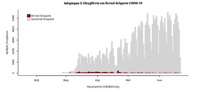 Από την 1η Ιανουαρίου 2020 μέχρι σήμερα, στα εργαστήρια που διενεργούν ελέγχους για τον νέο κορωνοϊό (SARS-CoV-2) και που δηλώνουν συστηματικά στον ΕΟΔΥ το σύνολο των δειγμάτων που ελέγχουν (θετικά και αρνητικά), έχουν συνολικά ελεγχθεί 285989 κλινικά δείγματα, εκ των οποίων τα 5279 (1.8%) ήταν θετικά στον κορωνοϊό (συμπεριλαμβάνονται και περισσότερα από ένα δείγματα ανά άτομο που ελέγχθηκε).
