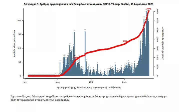 Τα στοιχεία που παρουσιάζονται αφορούν περιστατικά από την επιδημιολογική επιτήρηση της νόσου από το νέο κορωνοϊό (COVID19), με βάση τα δεδομένα που έχουν δηλωθεί στον ΕΟΔΥ και καταγραφεί μέχρι τις 16 Αυγούστου 2020 (ώρα 15:00). Τα νέα εργαστηριακά επιβεβαιωμένα κρούσματα της νόσου είναι 217, εκ των οποίων τα 15 εντοπίστηκαν κατόπιν ελέγχων στις πύλες εισόδου της χώρας. Ο συνολικός αριθμός των κρουσμάτων ανέρχεται σε 7075 (ημερήσια μεταβολή +3.2%), εκ των οποίων 55.2% άνδρες. Οι νέοι θάνατοι ασθενών με COVID-19 είναι 2, ενώ από την έναρξη της επιδημίας έχουν καταγραφεί συνολικά 228 θάνατοι. Η μέση ηλικία των ασθενών που απεβίωσαν είναι 77 έτη. Ο αριθμός των ασθενών που νοσηλεύονται διασωληνωμένοι είναι 24 (66.7% άνδρες). Η ημερήσια κατανομή των επιβεβαιωμένων κρουσμάτων είναι η ακόλουθη (η γραμμή παριστάνει την συνολική, αθροιστική κατανομή των κρουσμάτων).