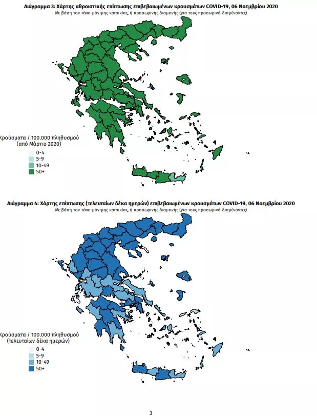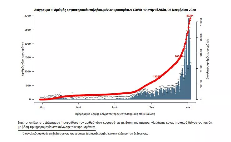 Τα στοιχεία που παρουσιάζονται αφορούν περιστατικά από την επιδημιολογική επιτήρηση της νόσου από το νέο κορωνοϊό (COVID19), με βάση τα δεδομένα που έχουν δηλωθεί στον ΕΟΔΥ και καταγραφεί μέχρι τις 06 Νοεμβρίου 2020 (ώρα 15:00). Τα νέα εργαστηριακά επιβεβαιωμένα κρούσματα της νόσου είναι 2448, εκ των οποίων 63 εντοπίστηκαν κατόπιν ελέγχων στις πύλες εισόδου της χώρας. Ο συνολικός αριθμός των κρουσμάτων ανέρχεται σε 52254 (ημερήσια μεταβολή +4.9%), εκ των οποίων 54.4% άνδρες.