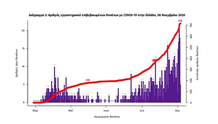 Τέλος, έχουμε 14 ακόμα καταγεγραμμένους θανάτους και 715* θανάτους συνολικά στη χώρα. 279 (39.0%) γυναίκες και οι υπόλοιποι άνδρες. Η διάμεση ηλικία των θανόντων συμπολιτών μας ήταν τα 79 έτη και το 96.5% είχε κάποιο υποκείμενο νόσημα ή/και ηλικία 70 ετών και άνω.