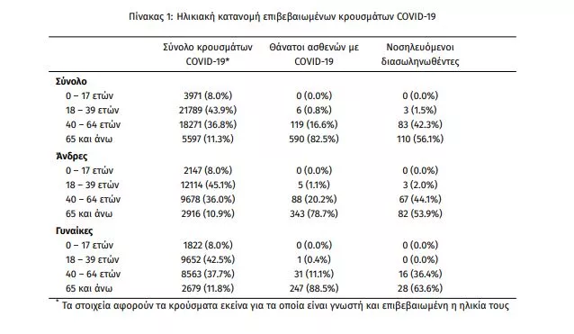 Από το σύνολο των 52254 κρουσμάτων, 4369 (8.4%) θεωρούνται σχετιζόμενα με ταξίδι από το εξωτερικό, 15192 (29.1%) είναι σχετιζόμενα με ήδη γνωστό κρούσμα και τα υπόλοιπα δεν σχετίζονται ούτε με ταξίδι ούτε με άλλο γνωστό κρούσμα ή είναι ακόμα υπό διερεύνηση. Η μέση ηλικία των κρουσμάτων είναι 38 έτη (εύρος 0 έως 103 ετών), ενώ η μέση ηλικία των θανάτων είναι 79 έτη (εύρος 25 έως 103 ετών). Η ηλικιακή κατανομή των (α) συνολικών κρουσμάτων, (β) των περιστατικών που κατέληξαν σε θάνατο και (γ) των ασθενών που νοσηλεύονται διασωληνωμένοι, είναι η ακόλουθη: