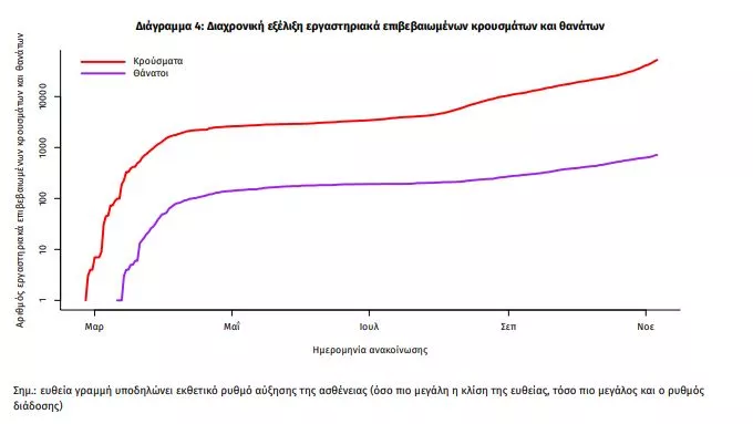 Η διαχρονική εξέλιξη των συνολικών κρουσμάτων και συνολικού αριθμού των θανάτων ασθενών COVID-19 παρουσιάζεται στο ακόλουθο διάγραμμα (σε λογαριθμική κλίμακα).