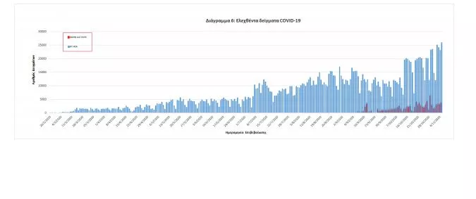 Δείγματα που έχουν ελεγχθεί: Από την 1η Ιανουαρίου 2020 μέχρι σήμερα, στα εργαστήρια που διενεργούν ελέγχους για τον νέο κορωνοϊό (SARS-CoV-2) και που δηλώνουν συστηματικά στον ΕΟΔΥ το σύνολο των δειγμάτων που ελέγχουν, έχουν συνολικά ελεγχθεί 1902458 κλινικά δείγματα ενώ από Μονάδες Υγείας και Κλιμάκια του ΕΟΔΥ που διενεργούν ελέγχους Rapid Ag έχουν