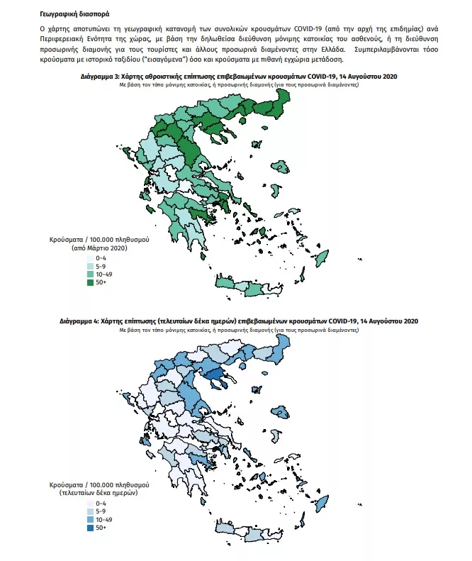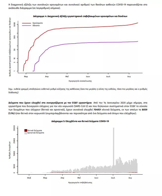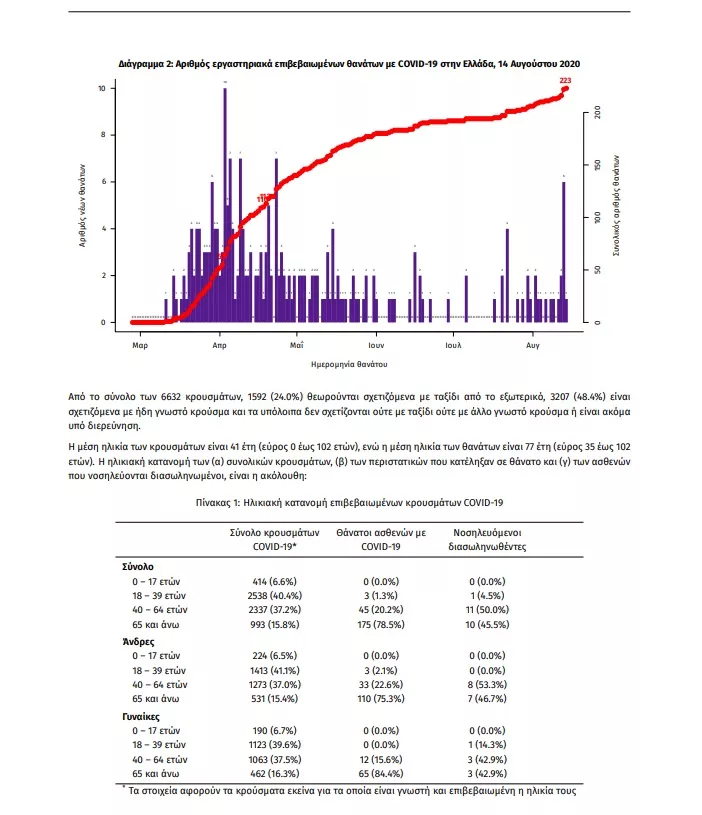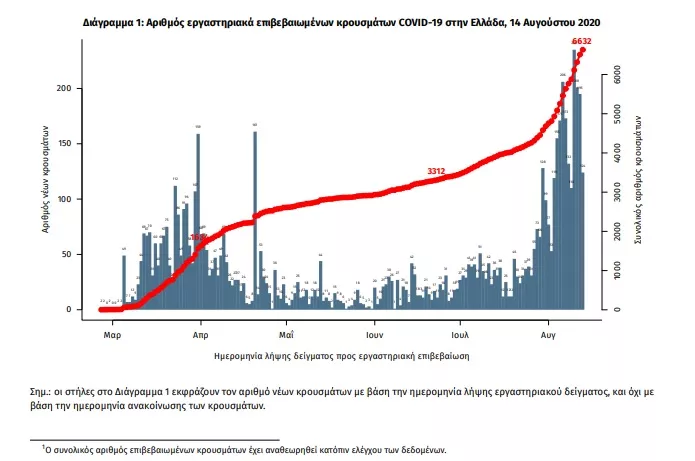 Τα στοιχεία που παρουσιάζονται αφορούν περιστατικά από την επιδημιολογική επιτήρηση της νόσου από το νέο κορωνοϊό (COVID19), με βάση τα δεδομένα που έχουν δηλωθεί στον ΕΟΔΥ και καταγραφεί μέχρι τις 14 Αυγούστου 2020 (ώρα 15:00). Τα νέα εργαστηριακά επιβεβαιωμένα κρούσματα της νόσου είναι 254, εκ των οποίων τα 20 εντοπίστηκαν κατόπιν ελέγχων στις πύλες εισόδου της χώρας. Ο συνολικός αριθμός των κρουσμάτων ανέρχεται σε 6632 (ημερήσια μεταβολή +4.0%), εκ των οποίων 55.0% άνδρες. 1 Οι νέοι θάνατοι ασθενών με COVID-19 είναι 2, ενώ από την έναρξη της επιδημίας έχουν καταγραφεί συνολικά 223 θάνατοι. Η μέση ηλικία των ασθενών που απεβίωσαν είναι 77 έτη. Ο αριθμός των ασθενών που νοσηλεύονται διασωληνωμένοι είναι 22 (68.2% άνδρες). Η ημερήσια κατανομή των επιβεβαιωμένων κρουσμάτων είναι η ακόλουθη (η γραμμή παριστάνει την συνολική, αθροιστική κατανομή των κρουσμάτων).