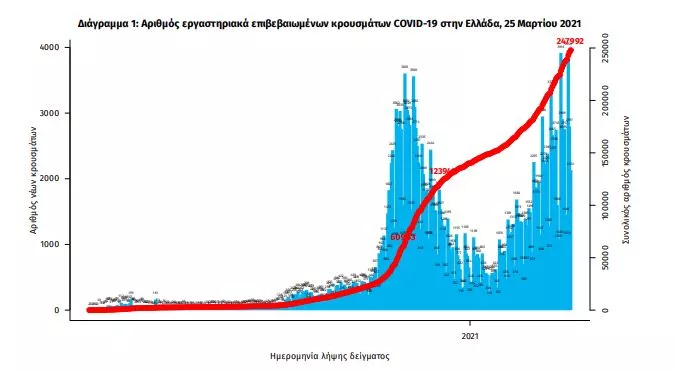 Τα νέα εργαστηριακά επιβεβαιωμένα κρούσματα της νόσου που καταγράφηκαν τις τελευταίες 24 ώρες είναι 2.588, εκ των οποίων 8 εντοπίστηκαν κατόπιν ελέγχων στις πύλες εισόδου της χώρας. Ο συνολικός αριθμός των κρουσμάτων ανέρχεται σε 247.992 (ημερήσια μεταβολή +1.1%), εκ των οποίων 51.5% άνδρες. Με βάση τα επιβεβαιωμένα κρούσματα των τελευταίων 7 ημερών, 76 θεωρούνται σχετιζόμενα με ταξίδι από το εξωτερικό και 2.969 είναι σχετιζόμενα με ήδη γνωστό κρούσμα.