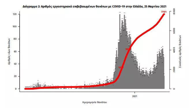 Οι νέοι θάνατοι ασθενών με COVID-19 είναι 52, ενώ από την έναρξη της επιδημίας έχουν καταγραφεί συνολικά 7.701 θάνατοι. Το 95.7% είχε υποκείμενο νόσημα ή/και ηλικία 70 ετών και άνω.
