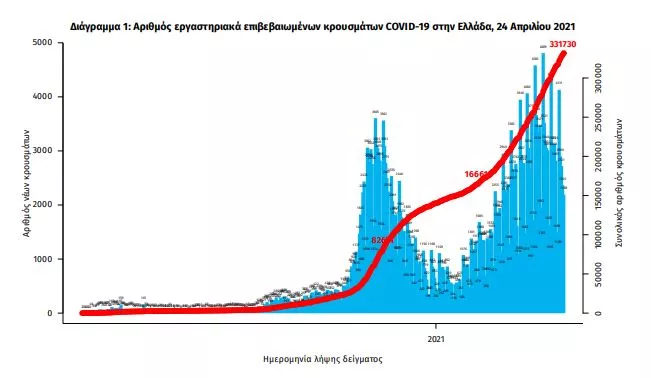 Τα νέα εργαστηριακά επιβεβαιωμένα κρούσματα της νόσου που καταγράφηκαν τις τελευταίες 24 ώρες είναι 2.597, εκ των οποίων 6 εντοπίστηκαν κατόπιν ελέγχων στις πύλες εισόδου της χώρας. Ο συνολικός αριθμός των κρουσμάτων ανέρχεται σε 331.730 (ημερήσια μεταβολή +0.8%), εκ των οποίων 51.3% άνδρες. Με βάση τα επιβεβαιωμένα κρούσματα των τελευταίων 7 ημερών, 66