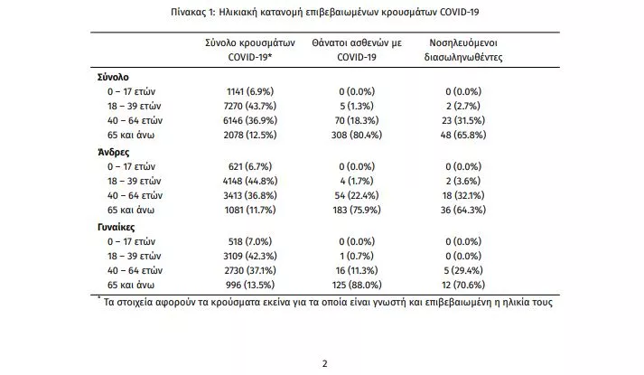 Η ηλικιακή κατανομή των (α) συνολικών κρουσμάτων, (β) των περιστατικών που κατέληξαν σε θάνατο και (γ) των ασθενών που νοσηλεύονται διασωληνωμένοι, είναι η ακόλουθη: