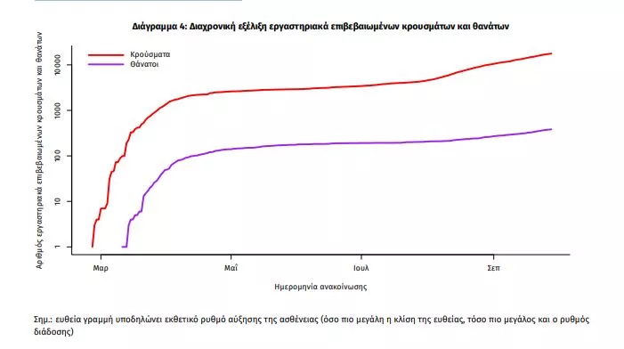Η διαχρονική εξέλιξη των συνολικών κρουσμάτων και συνολικού αριθμού των θανάτων ασθενών COVID-19 παρουσιάζεται στο ακόλουθο διάγραμμα (σε λογαριθμική κλίμακα).