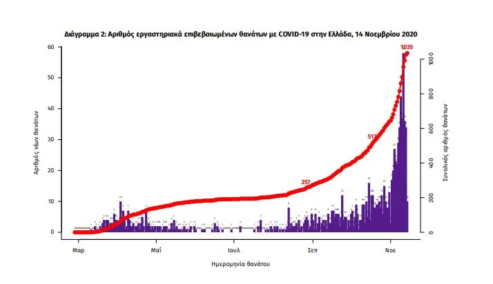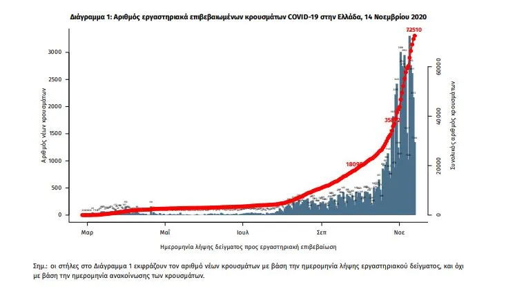 Τα νέα εργαστηριακά επιβεβαιωμένα κρούσματα της νόσου είναι 2835, εκ των οποίων 15 εντοπίστηκαν κατόπιν ελέγχων στις πύλες εισόδου της χώρας. Ο συνολικός αριθμός των κρουσμάτων ανέρχεται σε 72510 (ημερήσια μεταβολή +4.1%), εκ των οποίων 54.0% άνδρες. Οι νέοι θάνατοι ασθενών με COVID-19 είναι 38, ενώ από την έναρξη της επιδημίας έχουν καταγραφεί συνολικά 1035 θάνατοι.