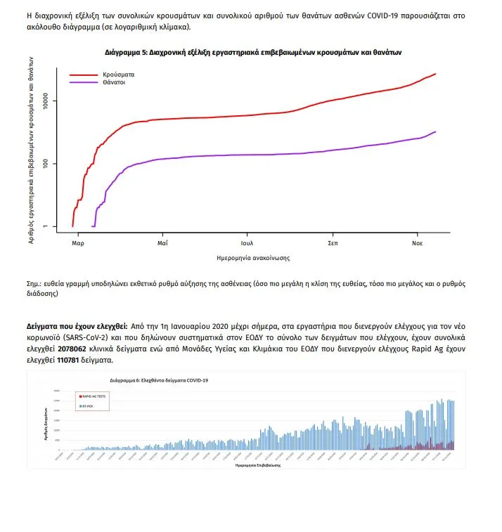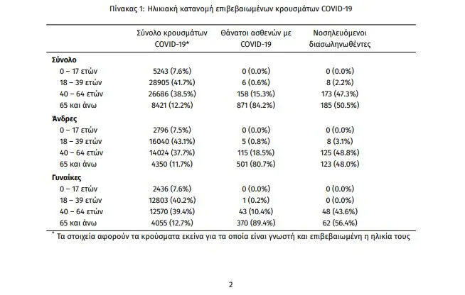 Η μέση ηλικία των κρουσμάτων είναι 40 έτη (εύρος 0 έως 104 ετών), ενώ η μέση ηλικία των θανάτων είναι 80 έτη (εύρος 25 έως 103 ετών). Η ηλικιακή κατανομή των (α) συνολικών κρουσμάτων, (β) των περιστατικών που κατέληξαν σε θάνατο και (γ) των ασθενών που νοσηλεύονται διασωληνωμένοι, είναι η ακόλουθη:
