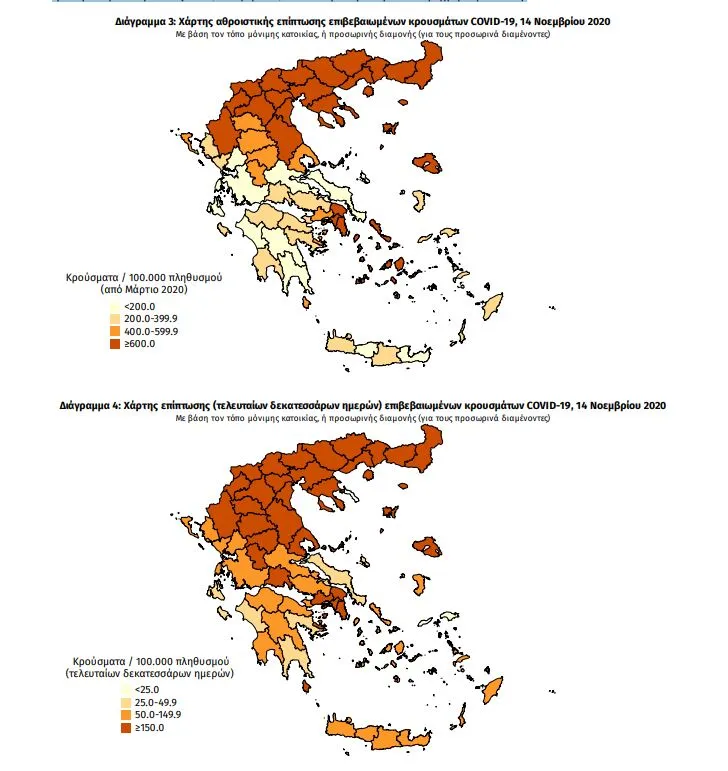 Ο χάρτης αποτυπώνει τη γεωγραφική κατανομή των συνολικών κρουσμάτων COVID-19 (από την αρχή της επιδημίας) ανά Περιφερειακή Ενότητα της χώρας, με βάση την δηλωθείσα διεύθυνση μόνιμης κατοικίας του ασθενούς, ή τη διεύθυνση προσωρινής διαμονής για τους τουρίστες και άλλους προσωρινά διαμένοντες στην Ελλάδα. Συμπεριλαμβάνονται τόσο κρούσματα με ιστορικό ταξιδίου (“εισαγόμενα”) όσο και κρούσματα με πιθανή εγχώρια μετάδοση.