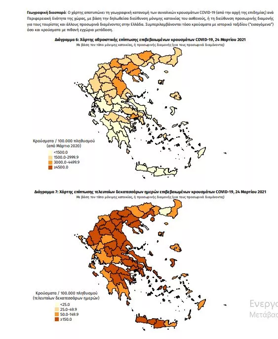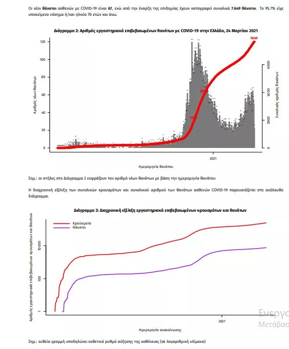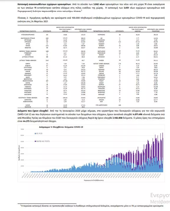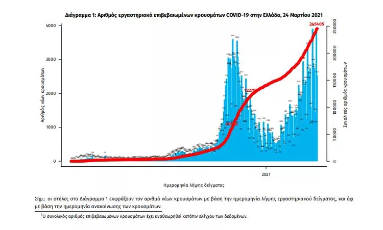 Τα στοιχεία που παρουσιάζονται αφορούν περιστατικά από την επιδημιολογική επιτήρηση της νόσου από το νέο κορωνοϊό (COVID19), με βάση τα δεδομένα που έχουν δηλωθεί στον ΕΟΔΥ και καταγραφεί μέχρι τις 24 Μαρτίου 2021 (ώρα 15:00). Τα νέα εργαστηριακά επιβεβαιωμένα κρούσματα της νόσου που καταγράφηκαν τις τελευταίες 24 ώρες είναι 3.062, εκ των οποίων 11 εντοπίστηκαν κατόπιν ελέγχων στις πύλες εισόδου της χώρας. Ο συνολικός αριθμός των κρουσμάτων ανέρχεται σε 245.405 (ημερήσια μεταβολή +1.3%), εκ των οποίων 51.5% άνδρες. 1 Με βάση τα επιβεβαιωμένα κρούσματα των τελευταίων 7 ημερών, 81 θεωρούνται σχετιζόμενα με ταξίδι από το εξωτερικό και 3.038 είναι σχετιζόμενα με ήδη γνωστό κρούσμα. To 𝑅𝑡 για την επικράτεια εκτιμάται σε 1.02 (95%Crl: 0.28-1.59) Ημερήσια εξέλιξη της πανδημίας: Η ημερήσια κατανομή των επιβεβαιωμένων κρουσμάτων είναι η ακόλουθη (η γραμμή παριστάνει την συνολική, αθροιστική κατανομή των κρουσμάτων).