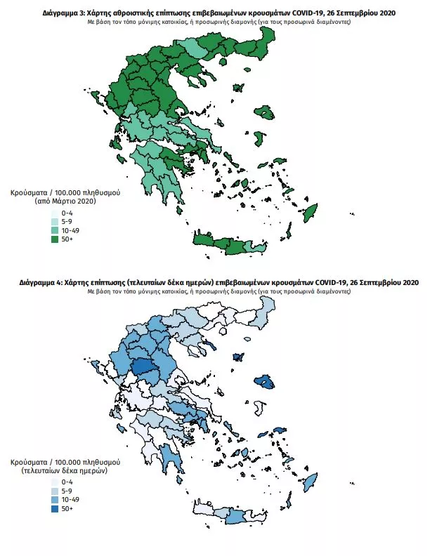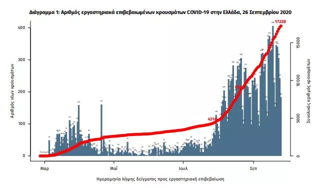 Ο ΕΟΔΥ σήμερα (26/9) ανακοινώνει 315 νέα κρούσματα του νέου ιού στη χώρα, εκ των οποίων 59 συνδέονται με γνωστές συρροές και 19 εντοπίστηκαν κατόπιν ελέγχων στις πύλες εισόδου της χώρας. Ο συνολικός αριθμός των κρουσμάτων είναι 17228, εκ των οποίων το 55.8% άνδρες.