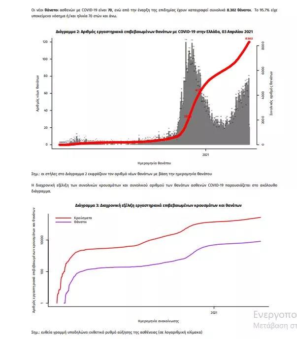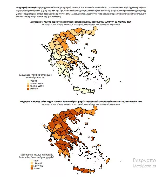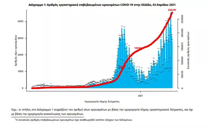 Τα στοιχεία που παρουσιάζονται αφορούν περιστατικά από την επιδημιολογική επιτήρηση της νόσου από το νέο κορωνοϊό (COVID19), με βάση τα δεδομένα που έχουν δηλωθεί στον ΕΟΔΥ και καταγραφεί μέχρι τις 03 Απριλίου 2021 (ώρα 15:00). Τα νέα εργαστηριακά επιβεβαιωμένα κρούσματα της νόσου που καταγράφηκαν τις τελευταίες 24 ώρες είναι 3.232, εκ των οποίων 4 εντοπίστηκαν κατόπιν ελέγχων στις πύλες εισόδου της χώρας. Ο συνολικός αριθμός των κρουσμάτων ανέρχεται σε 273.459 (ημερήσια μεταβολή +1.2%), εκ των οποίων 51.5% άνδρες. 1 Με βάση τα επιβεβαιωμένα κρούσματα των τελευταίων 7 ημερών, 93 θεωρούνται σχετιζόμενα με ταξίδι από το εξωτερικό και 3.270 είναι σχετιζόμενα με ήδη γνωστό κρούσμα. Ημερήσια εξέλιξη της πανδημίας: Η ημερήσια κατανομή των επιβεβαιωμένων κρουσμάτων είναι η ακόλουθη (η γραμμή παριστάνει την συνολική, αθροιστική κατανομή των κρουσμάτων).