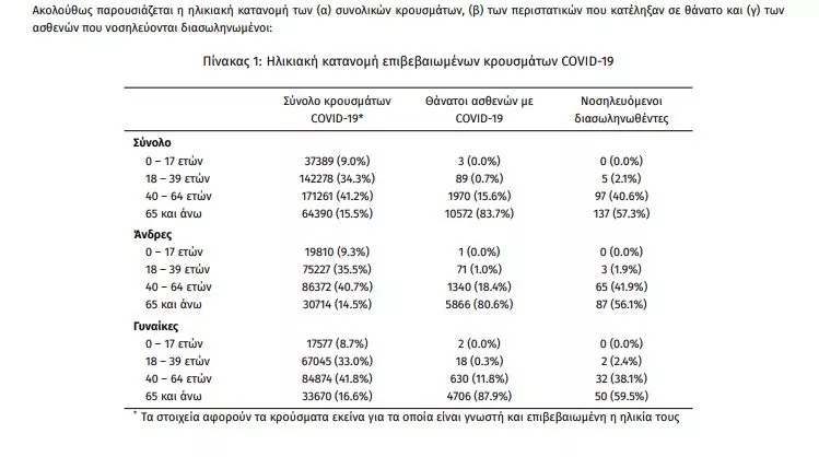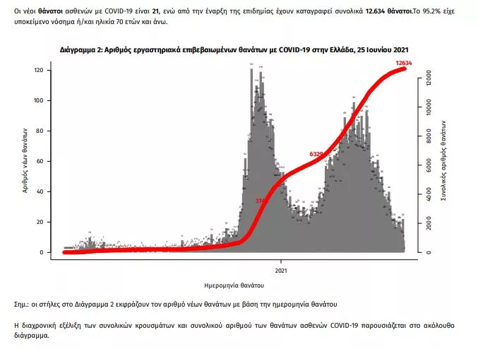 Οι νέοι θάνατοι ασθενών με COVID-19 είναι 21, ενώ από την έναρξη της επιδημίας έχουν καταγραφεί συνολικά 12.634 θάνατοι.Το 95.2% είχε υποκείμενο νόσημα ή/και ηλικία 70 ετών και άνω.