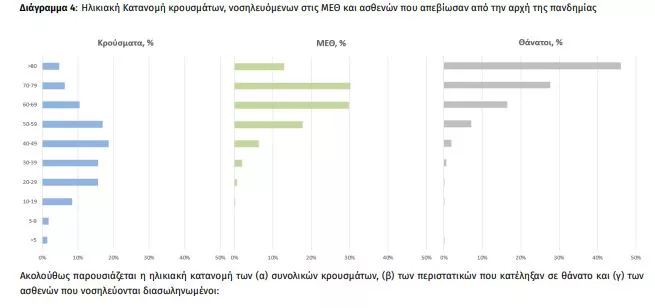 Ο αριθμός των ασθενών που νοσηλεύονται διασωληνωμένοι είναι 239 (65.3% άνδρες). Η διάμεση ηλικία τους είναι 67 έτη. To 82.8% έχει υποκείμενο νόσημα ή/και ηλικία 70 ετών και άνω. Από την αρχή της πανδημίας έχουν εξέλθει από τις ΜΕΘ 2.649 ασθενείς. Οι εισαγωγές νέων ασθενών Covid-19 στα νοσοκομεία της επικράτειας είναι 53 (ημερήσια μεταβολή -18.46%). Ο μέσος όρος εισαγωγών του επταημέρου είναι 58 ασθενείς.Η διάμεση ηλικία των κρουσμάτων είναι 43 έτη (εύρος 0.2 έως 106 έτη), ενώ η διάμεση ηλικία των θανόντων είναι 78 έτη (εύρος 0.2 έως 106 έτη).