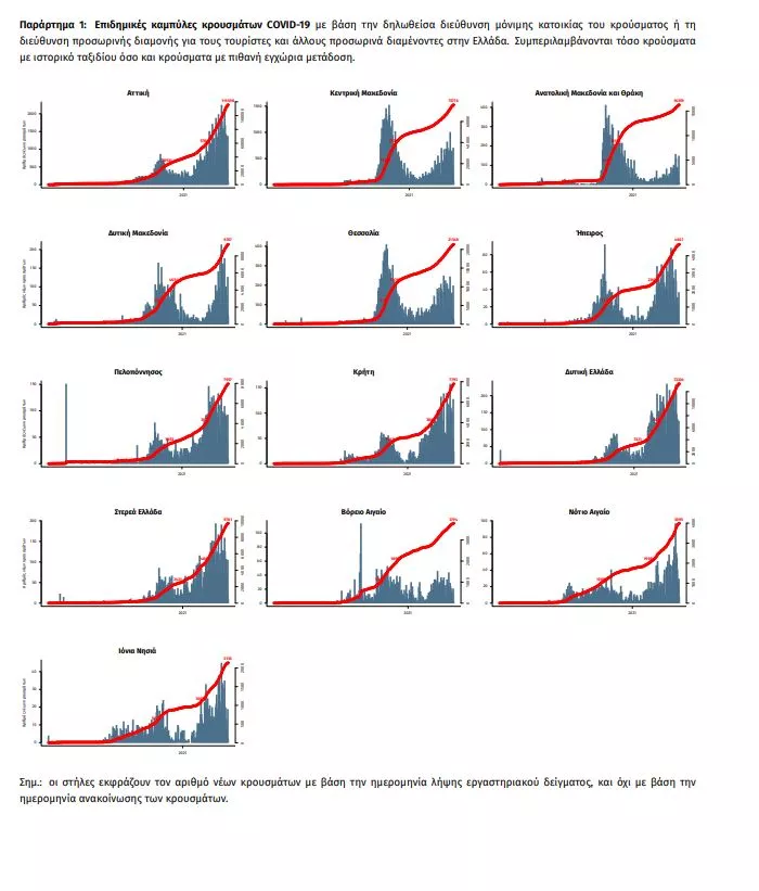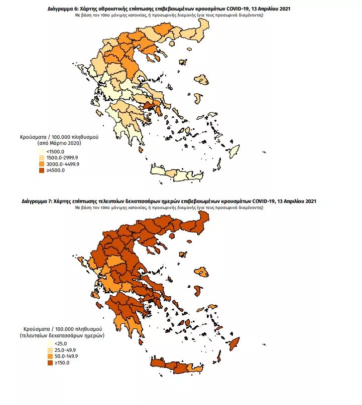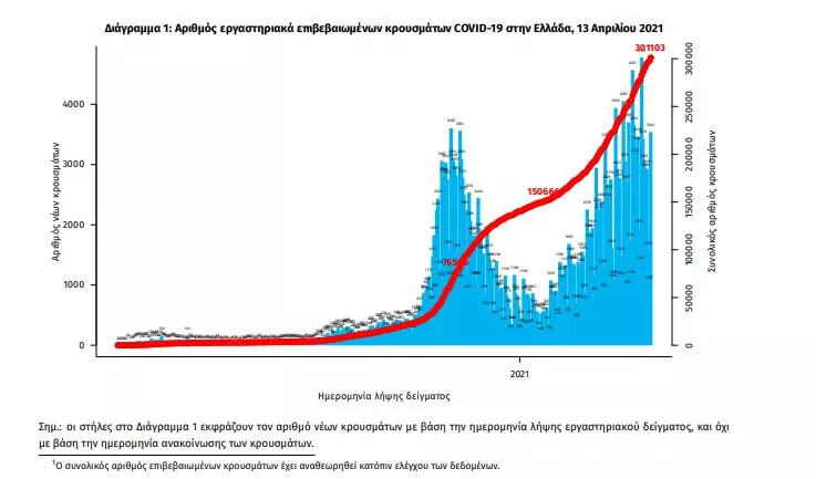 Τα στοιχεία που παρουσιάζονται αφορούν περιστατικά από την επιδημιολογική επιτήρηση της νόσου από το νέο κορωνοϊό (COVID19), με βάση τα δεδομένα που έχουν δηλωθεί στον ΕΟΔΥ και καταγραφεί μέχρι τις 13 Απριλίου 2021 (ώρα 15:00). Τα νέα εργαστηριακά επιβεβαιωμένα κρούσματα της νόσου που καταγράφηκαν τις τελευταίες 24 ώρες είναι 4.033, εκ των οποίων 15 εντοπίστηκαν κατόπιν ελέγχων στις πύλες εισόδου της χώρας. Ο συνολικός αριθμός των κρουσμάτων ανέρχεται σε 301.103 (ημερήσια μεταβολή +1.4%), εκ των οποίων 51.3% άνδρες. 1 Με βάση τα επιβεβαιωμένα κρούσματα των τελευταίων 7 ημερών, 55 θεωρούνται σχετιζόμενα με ταξίδι από το εξωτερικό και 2.401 είναι σχετιζόμενα με ήδη γνωστό κρούσμα. Ημερήσια εξέλιξη της πανδημίας: Η ημερήσια κατανομή των επιβεβαιωμένων κρουσμάτων είναι η ακόλουθη (η γραμμή παριστάνει την συνολική, αθροιστική κατανομή των κρουσμάτων).