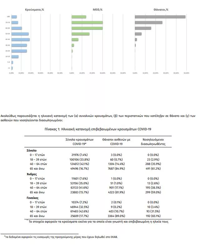 Ο αριθμός των ασθενών που νοσηλεύονται διασωληνωμένοι είναι 802 (63.2% άνδρες). Η διάμεση ηλικία τους είναι 67 έτη. To 83.4% έχει υποκείμενο νόσημα ή/και ηλικία 70 ετών και άνω. Από την αρχή της πανδημίας έχουν εξέλθει από τις ΜΕΘ 1.901 ασθενείς. Οι εισαγωγές2 νέων ασθενών Covid-19 στα νοσοκομεία της επικράτειας είναι 458 (ημερήσια μεταβολή -15.03%). Ο μέσος όρος εισαγωγών του επταημέρου είναι 520 ασθενείς.Η διάμεση ηλικία των κρουσμάτων είναι 44 έτη (εύρος 0.2 έως 106 έτη), ενώ η διάμεση ηλικία των θανόντων είναι 79 έτη (εύρος 0.2 έως 106 έτη).