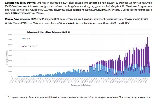 Τα νέα εργαστηριακά επιβεβαιωμένα κρούσματα της νόσου που καταγράφηκαν τις τελευταίες 24 ώρες είναι 4033 σε 76.070 τεστ με τη θετικότητα στο 5,3%.
