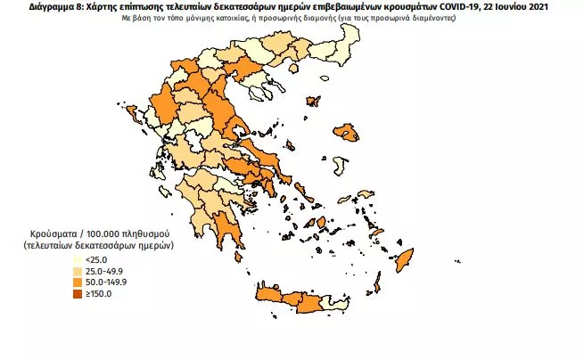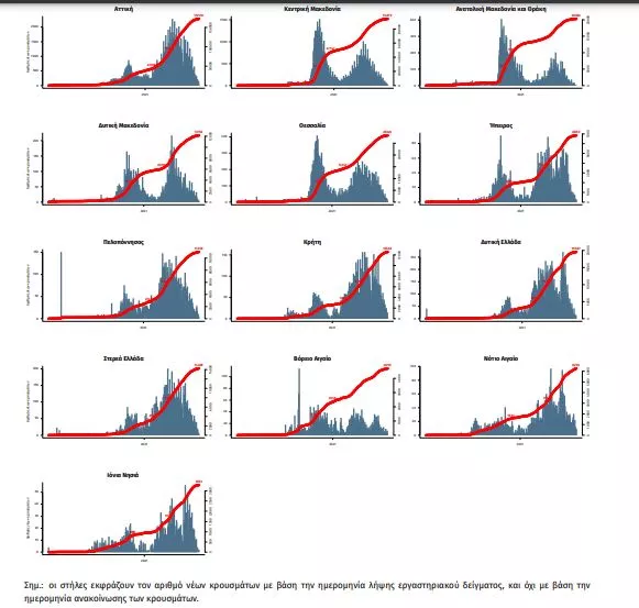 Επιδημικές καμπύλες κρουσμάτων COVID-19 με βάση την δηλωθείσα διεύθυνση μόνιμης κατοικίας του κρούσματος ή τη διεύθυνση προσωρινής διαμονής για τους τουρίστες και άλλους προσωρινά διαμένοντες στην Ελλάδα. Συμπεριλαμβάνονται τόσο κρούσματα με ιστορικό ταξιδίου όσο και κρούσματα με πιθανή εγχώρια μετάδοση.