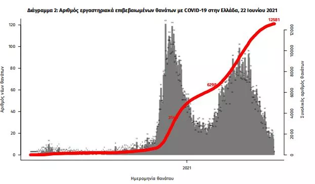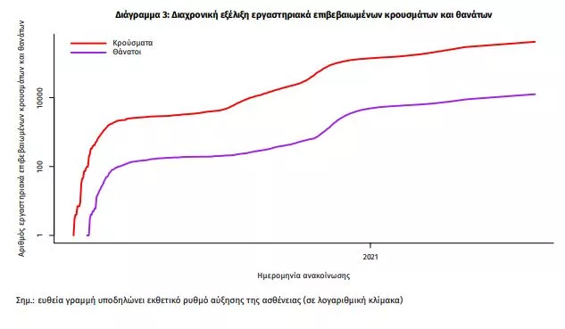 Η διαχρονική εξέλιξη των συνολικών κρουσμάτων και συνολικού αριθμού των θανάτων ασθενών COVID-19 παρουσιάζεται στο ακόλουθο διάγραμμα.