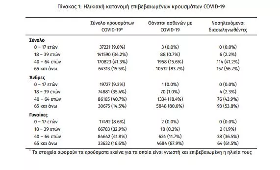 Ο αριθμός των ασθενών που νοσηλεύονται διασωληνωμένοι είναι 277 (62.8% άνδρες). Η διάμεση ηλικία τους είναι 67 έτη. To 82.7% έχει υποκείμενο νόσημα ή/και ηλικία 70 ετών και άνω. Από την αρχή της πανδημίας έχουν εξέλθει από τις ΜΕΘ 2.619 ασθενείς. Οι εισαγωγές2 νέων ασθενών Covid-19 στα νοσοκομεία της επικράτειας είναι 59 (ημερήσια μεταβολή +22.92%). Ο μέσος όρος εισαγωγών του επταημέρου είναι 63 ασθενείς.Η διάμεση ηλικία των κρουσμάτων είναι 43 έτη (εύρος 0.2 έως 106 έτη), ενώ η διάμεση ηλικία των θανόντων είναι 78 έτη (εύρος 0.2 έως 106 έτη)