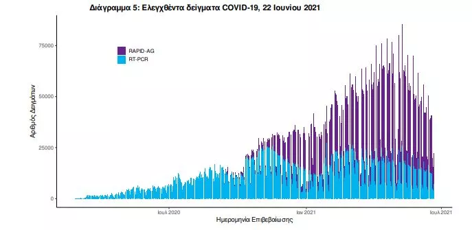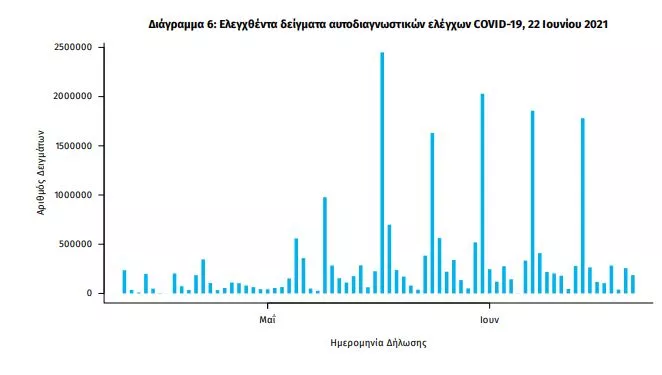 Αυτοδιαγνωστικοί έλεγχοι (Self-tests): Έως 21 Ιουνίου 2021, έχουν καταγραφεί ηλεκτρονικά 22.453.750 δηλώσεις αποτελέσματος αυτοδιαγνωστικού ελέγχου, ενώ 420.433 άτομα προσήλθαν για επανέλεγχο.