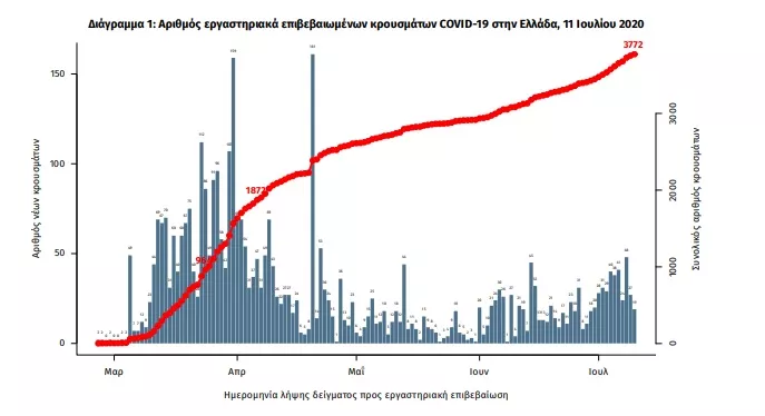 Δείγματα που έχουν ελεγχθεί στα συνεργαζόμενα με τον ΕΟΔΥ εργαστήρια: Από την 1η Ιανουαρίου 2020 μέχρι σήμερα, στα εργαστήρια που διενεργούν ελέγχους για τον νέο κορωνοϊό (SARS-CoV-2) και που δηλώνουν συστηματικά στον ΕΟΔΥ το σύνολο των δειγμάτων που ελέγχουν (θετικά και αρνητικά), έχουν συνολικά ελεγχθεί 371167 κλινικά δείγματα, εκ των οποίων τα 5934 (1.6%) ήταν θετικά στον κορωνοϊό (συμπεριλαμβάνονται και περισσότερα από ένα δείγματα ανά άτομο που ελέγχθηκε). Από το ανωτέρω σύνολο δειγμάτων, τα 40279 (10.9%) αφορούν δειγματοληψίες σε εισερχόμενες αεροπορικές πτήσεις (από τις 12 Ιουνίου). Εξ’αυτών τα 84 (0.2%) θετικά στον κορωνοϊό