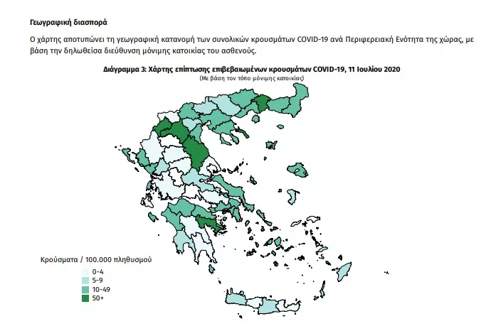 Πιο συγκεκριμένα, τα στοιχεία που παρουσιάζονται αφορούν περιστατικά από την επιδημιολογική επιτήρηση της νόσου από το νέο κορωνοϊό (COVID19), με βάση τα δεδομένα που έχουν δηλωθεί στον ΕΟΔΥ και καταγραφεί μέχρι τις 11 Ιουλίου 2020 (ώρα 15:00).