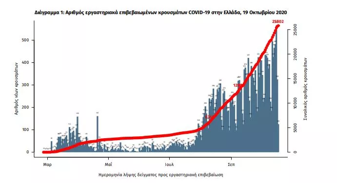 Τα νέα εργαστηριακά επιβεβαιωμένα κρούσματα της νόσου είναι 438, εκ των οποίων 62 συνδέονται με γνωστές συρροές και 42 εντοπίστηκαν κατόπιν ελέγχων στις πύλες εισόδου της χώρας. Ο συνολικός αριθμός των κρουσμάτων ανέρχεται σε 25802 (ημερήσια μεταβολή +1.7%), εκ των οποίων 55.6% άνδρες.