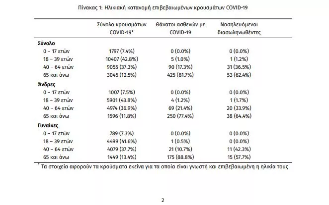Η μέση ηλικία των κρουσμάτων είναι 39 έτη (εύρος 0 έως 102 ετών), ενώ η μέση ηλικία των θανάτων είναι 79 έτη (εύρος 25 έως 102 ετών). Η ηλικιακή κατανομή των (α) συνολικών κρουσμάτων, (β) των περιστατικών που κατέληξαν σε θάνατο και (γ) των ασθενών που νοσηλεύονται διασωληνωμένοι, είναι η ακόλουθη: