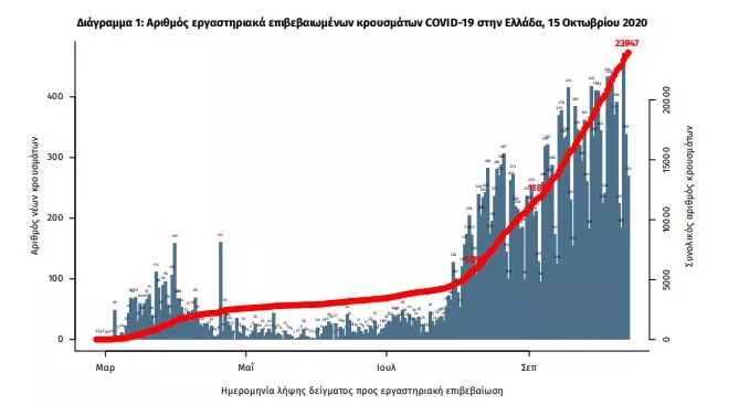 Τα νέα εργαστηριακά επιβεβαιωμένα κρούσματα της νόσου είναι 453, εκ των οποίων 63 συνδέονται με γνωστές συρροές και 27 εντοπίστηκαν κατόπιν ελέγχων στις πύλες εισόδου της χώρας. Ο συνολικός αριθμός των κρουσμάτων ανέρχεται σε 23947 (ημερήσια μεταβολή +1.9%), εκ των οποίων 55.6% άνδρες.