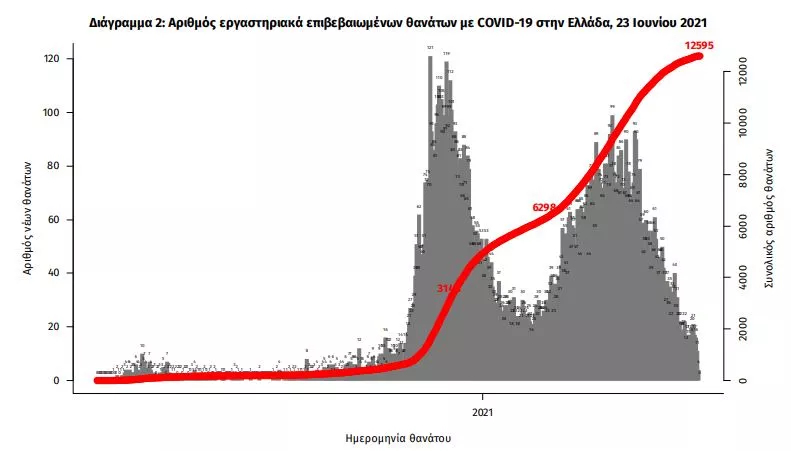 Οι νέοι θάνατοι ασθενών με COVID-19 είναι 14, ενώ από την έναρξη της επιδημίας έχουν καταγραφεί συνολικά 12.595 θάνατοι. Το 95.2% είχε υποκείμενο νόσημα ή/και ηλικία 70 ετών και άνω.