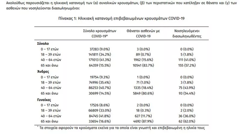 Ο αριθμός των ασθενών που νοσηλεύονται διασωληνωμένοι είναι 271 (63.5% άνδρες). Η διάμεση ηλικία τους είναι 67 έτη. To 82.7% έχει υποκείμενο νόσημα ή/και ηλικία 70 ετών και άνω. Από την αρχή της πανδημίας έχουν εξέλθει από τις ΜΕΘ 2.628 ασθενείς. Οι εισαγωγές νέων ασθενών Covid-19 στα νοσοκομεία της επικράτειας είναι 50 (ημερήσια μεταβολή -15.25%). Ο μέσος όρος εισαγωγών του επταημέρου είναι 59 ασθενείς.Η διάμεση ηλικία των κρουσμάτων είναι 43 έτη (εύρος 0.2 έως 106 έτη), ενώ η διάμεση ηλικία των θανόντων είναι 78 έτη (εύρος 0.2 έως 106 έτη).
