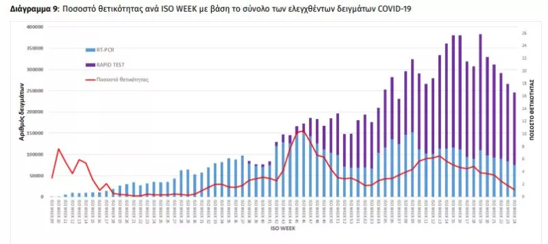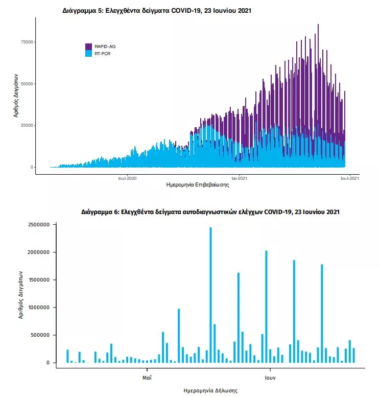 Δείγματα που έχουν ελεγχθεί: Από την 1η Ιανουαρίου 2020 μέχρι σήμερα, στα εργαστήρια που διενεργούν ελέγχους για τον νέο κορωνοϊό (SARS-CoV-2) και που δηλώνουν συστηματικά το σύνολο των δειγμάτων που ελέγχουν, έχουν συνολικά ελεγχθεί 5.341.654 κλινικά δείγματα ενώ από Μονάδες Υγείας και Κλιμάκια του ΕΟΔΥ που διενεργούν ελέγχους Rapid Ag έχουν ελεγχθεί 5.050.929 δείγματα. O μέσος όρος τουεπταημέρου είναι 32.038 δειγματοληπτικοί έλεγχοι.