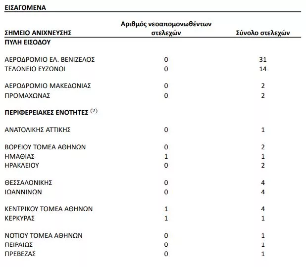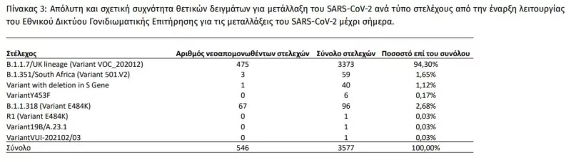 Συνολικά έχουν ταυτοποιηθεί 3.373 θετικά για την παρουσία μετάλλαξης Β.1.1.7/UK lineage (Variant VOC_202012) (Πίνακας 4) και 59 θετικά για την παρουσία μετάλλαξης B.1.351/South Africa (Variant 501.V2) από την έναρξη λειτουργίας του Εθνικού Δικτύου Γονιδιωματικής Επιτήρησης για τις μεταλλάξεις του SARS-CoV-2 έως σήμερα. Από τα 59 θετικά στελέχη για την παρουσία μετάλλαξης Lineage B.1.351/South Africa (Variant 501.V2) τα 57 είναι εγχώρια, εκ των οποίων 47 προέρχονται από την Περιφερειακή Ενότητα Θεσσαλονίκης, 2 από την Περιφερειακή Ενότητα Ιωαννίνων, 5 από την Περιφέρεια Αττικής, 1 από την Περιφερειακή Ενότητα Αιτωλοακαρνανίας, 1 από την Περιφερειακή Ενότητα Ηρακλείου και 1 από την Περιφερειακή Ενότητα Χανίων.