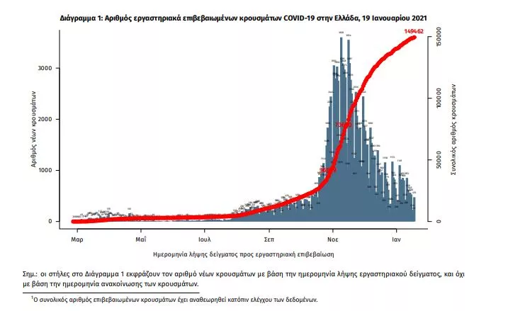 Τα στοιχεία που παρουσιάζονται αφορούν περιστατικά από την επιδημιολογική επιτήρηση της νόσου από το νέο κορωνοϊό (COVID19), με βάση τα δεδομένα που έχουν δηλωθεί στον ΕΟΔΥ και καταγραφεί μέχρι τις 19 Ιανουαρίου 2021 (ώρα 15:00). Τα νέα εργαστηριακά επιβεβαιωμένα κρούσματα της νόσου είναι 566, εκ των οποίων 17 εντοπίστηκαν κατόπιν ελέγχων στις πύλες εισόδου της χώρας. Ο συνολικός αριθμός των κρουσμάτων ανέρχεται σε 149462 (ημερήσια μεταβολή +0.4%), εκ των οποίων 52.1% άνδρες. 1 Οι νέοι θάνατοι ασθενών με COVID-19 είναι 30, ενώ από την έναρξη της επιδημίας έχουν καταγραφεί συνολικά 5518 θάνατοι. Η διάμεση ηλικία των ασθενών που απεβίωσαν είναι 79 έτη. Ο αριθμός των ασθενών που νοσηλεύονται διασωληνωμένοι είναι 320 (70.3% άνδρες). Η ημερήσια κατανομή των επιβεβαιωμένων κρουσμάτων είναι η ακόλουθη (η γραμμή παριστάνει την συνολική, αθροιστική κατανομή των κρουσμάτων).