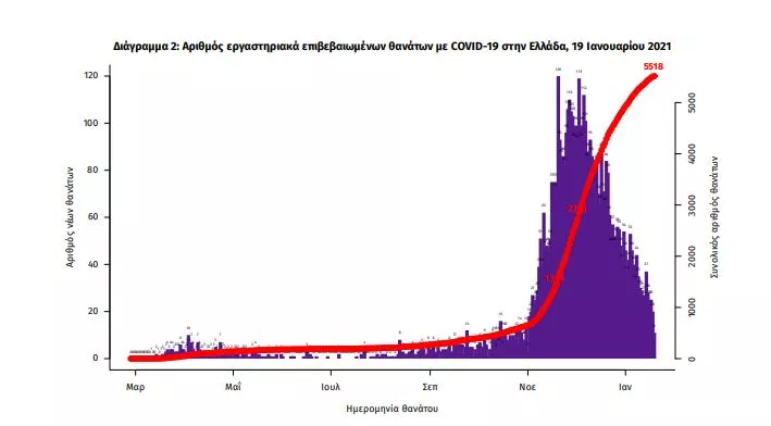 Τέλος, έχουμε 30 νέους θανάτους από τη νόσο COVID-19, φθάνοντας τους 5518 θανάτους συνολικά στη χώρα, εκ των οποίων 3254 (59.0%) άνδρες. Η διάμεση ηλικία των θανόντων συμπολιτών μας ήταν τα 79 έτη και το 95.4% είχε κάποιο υποκείμενο νόσημα ή/και ηλικία 70 ετών και άνω.