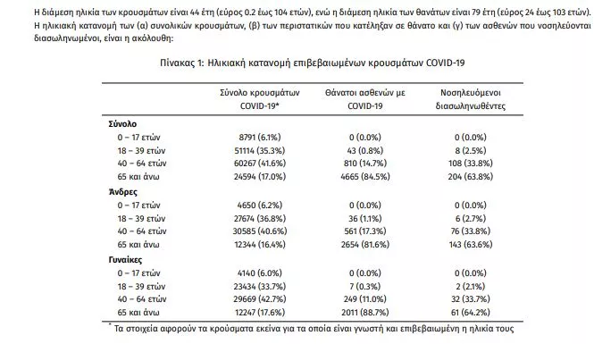 Η διάμεση ηλικία των κρουσμάτων είναι 44 έτη (εύρος 0.2 έως 104 ετών), ενώ η διάμεση ηλικία των θανάτων είναι 79 έτη (εύρος 24 έως 103 ετών). Η ηλικιακή κατανομή των (α) συνολικών κρουσμάτων, (β) των περιστατικών που κατέληξαν σε θάνατο και (γ) των ασθενών που νοσηλεύονται διασωληνωμένοι, είναι η ακόλουθη: