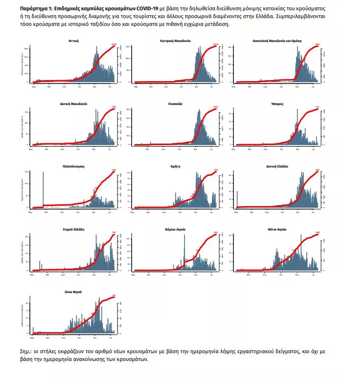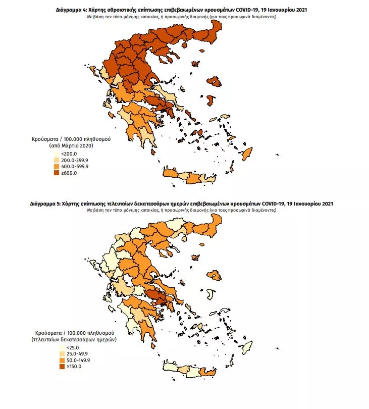 Ο χάρτης αποτυπώνει τη γεωγραφική κατανομή των συνολικών κρουσμάτων COVID-19 (από την αρχή της επιδημίας) ανά Περιφερειακή Ενότητα της χώρας, με βάση την δηλωθείσα διεύθυνση μόνιμης κατοικίας του ασθενούς, ή τη διεύθυνση προσωρινής διαμονής για τους τουρίστες και άλλους προσωρινά διαμένοντες στην Ελλάδα. Συμπεριλαμβάνονται τόσο κρούσματα με ιστορικό ταξιδίου (“εισαγόμενα”) όσο και κρούσματα με πιθανή εγχώρια μετάδοση.