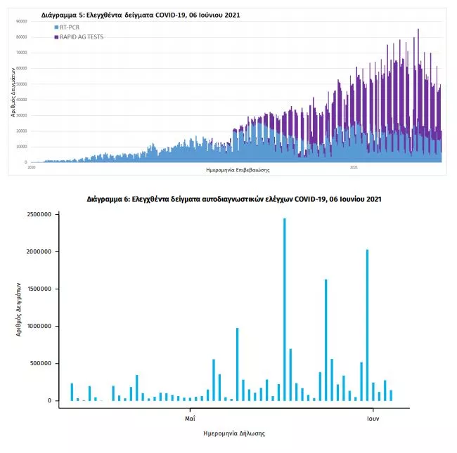 Αυτοδιαγνωστικοί έλεγχοι (Self-tests): Έως 05 Ιουνίου 2021, έχουν καταγραφεί ηλεκτρονικά 15.892.018 δηλώσεις αποτελέσματος αυτοδιαγνωστικού ελέγχου, ενώ 318.392 άτομα προσήλθαν για επανέλεγχο.