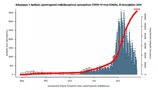Τα νέα εργαστηριακά επιβεβαιωμένα κρούσματα της νόσου είναι 588, εκ των οποίων 11 εντοπίστηκαν κατόπιν ελέγχων στις πύλες εισόδου της χώρας. Ο συνολικός αριθμός των κρουσμάτων ανέρχεται σε 131072 (ημερήσια μεταβολή +0.5%), εκ των οποίων 52.5% άνδρες.