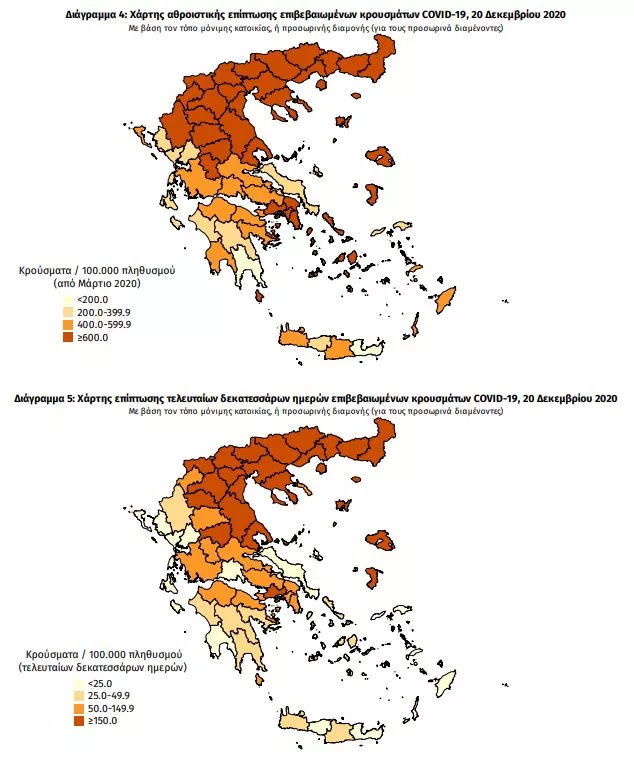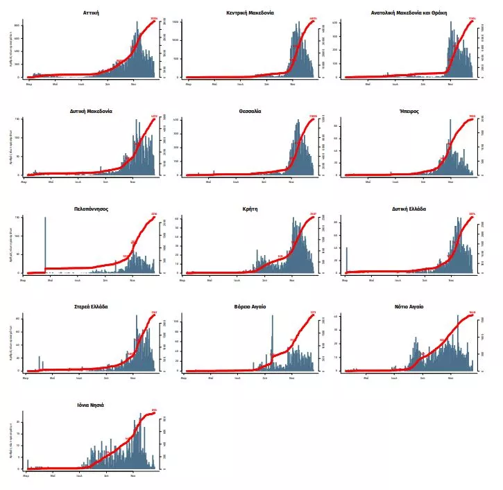 Επιδημικές καμπύλες κρουσμάτων COVID-19 με βάση την δηλωθείσα διεύθυνση μόνιμης κατοικίας του κρούσματος ή τη διεύθυνση προσωρινής διαμονής για τους τουρίστες και άλλους προσωρινά διαμένοντες στην Ελλάδα. Συμπεριλαμβάνονται τόσο κρούσματα με ιστορικό ταξιδίου όσο και κρούσματα με πιθανή εγχώρια μετάδοση.