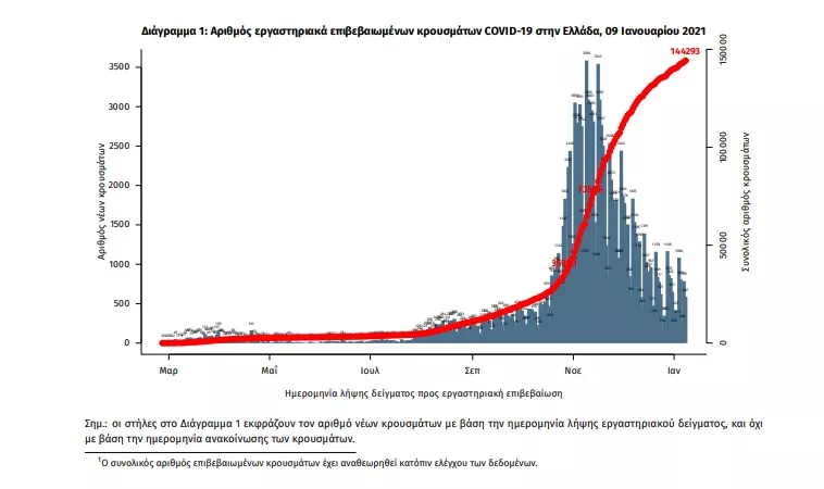 Τα στοιχεία που παρουσιάζονται αφορούν περιστατικά από την επιδημιολογική επιτήρηση της νόσου από το νέο κορωνοϊό (COVID19), με βάση τα δεδομένα που έχουν δηλωθεί στον ΕΟΔΥ και καταγραφεί μέχρι τις 09 Ιανουαρίου 2021 (ώρα 15:00). Τα νέα εργαστηριακά επιβεβαιωμένα κρούσματα της νόσου είναι 800, εκ των οποίων 11 εντοπίστηκαν κατόπιν ελέγχων στις πύλες εισόδου της χώρας. Ο συνολικός αριθμός των κρουσμάτων ανέρχεται σε 144293 (ημερήσια μεταβολή +0.6%), εκ των οποίων 52.2% άνδρες. 1 Οι νέοι θάνατοι ασθενών με COVID-19 είναι 32, ενώ από την έναρξη της επιδημίας έχουν καταγραφεί συνολικά 5227 θάνατοι. Η διάμεση ηλικία των ασθενών που απεβίωσαν είναι 79 έτη. Ο αριθμός των ασθενών που νοσηλεύονται διασωληνωμένοι είναι 362 (69.1% άνδρες). Η ημερήσια κατανομή των επιβεβαιωμένων κρουσμάτων είναι η ακόλουθη (η γραμμή παριστάνει την συνολική, αθροιστική κατανομή των κρουσμάτων).